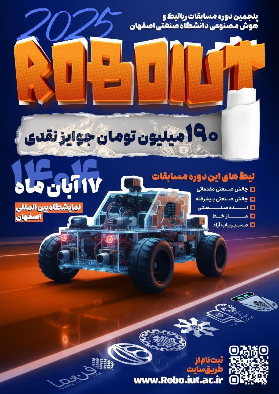 زمان برگزاری دومین دوره مسابقه رباتیک RoboIUT، از تاریخ 17 آبان ماه 1404 در چهار روز متوالی 17 الی 20 آبان ماه همزمان با نمایشگاه فن نما در نمایشگاه بین المللی امیرکبیر اصفهان(واقع درنزدیکی شهر رویاها) برگزار میشود.