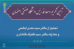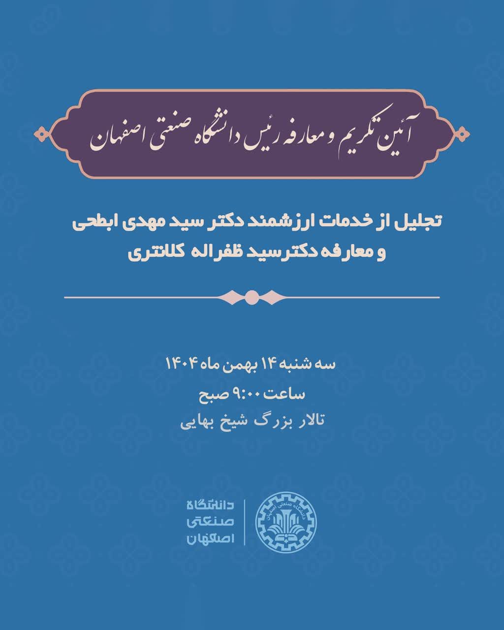 آیین تکریم و قدردانی از خدمات ارزشمند دکتر سید مهدی ابطحی و معارفه دکتر سید ظفراله کلانتری بهعنوان رئیس دانشگاه صنعتی اصفهان، با حضور جناب آقای دکتر واحدی، معاون محترم آموزشی وزارت علوم، تحقیقات و فناوری، برگزار میشود.